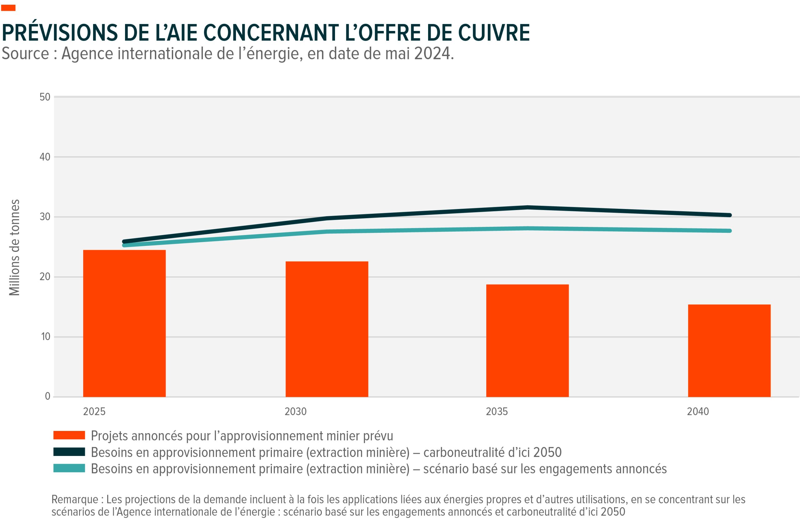 Compte tenu des besoins actuels en électricité et des engagements mondiaux en matière de carboneutralité, la demande de cuivre demeure élevée. Toutefois, l’offre pourrait ne pas suivre.