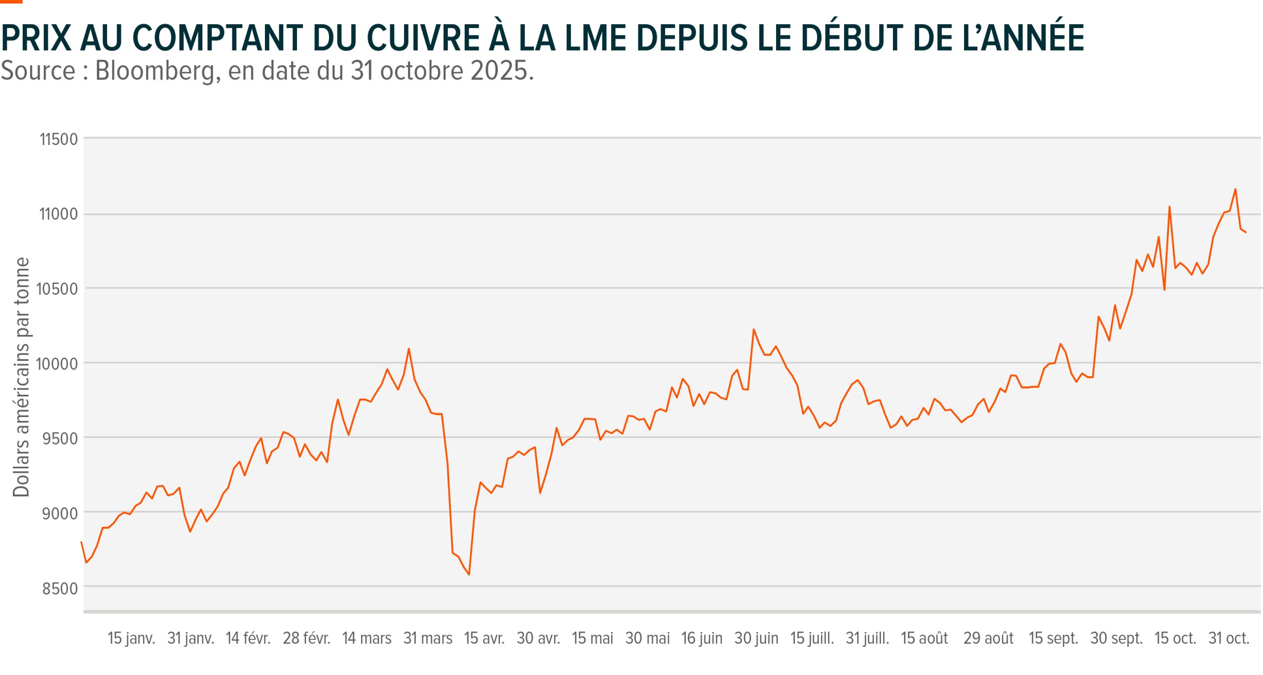 - L’importance stratégique du cuivre est incontournable. Pierre angulaire de l’électrification, de l’énergie renouvelable et des infrastructures liées à l’intelligence artificielle (IA), le cuivre est de plus en plus sollicité. La croissance de la demande provenant des centres de données et des véhicules électriques, conjuguée à une offre limitée et aux interruptions de production minière, resserre le marché et accentue à la fois la pression sur les prix et la volatilité.