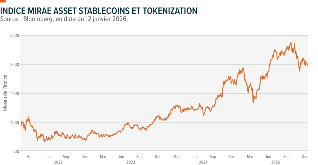 L’indice Mirae Asset Stablecoins and Tokenization, suivi par TOKN, mesure le rendement des sociétés qui tirent des revenus substantiels ou une valeur stratégique de ces technologies.