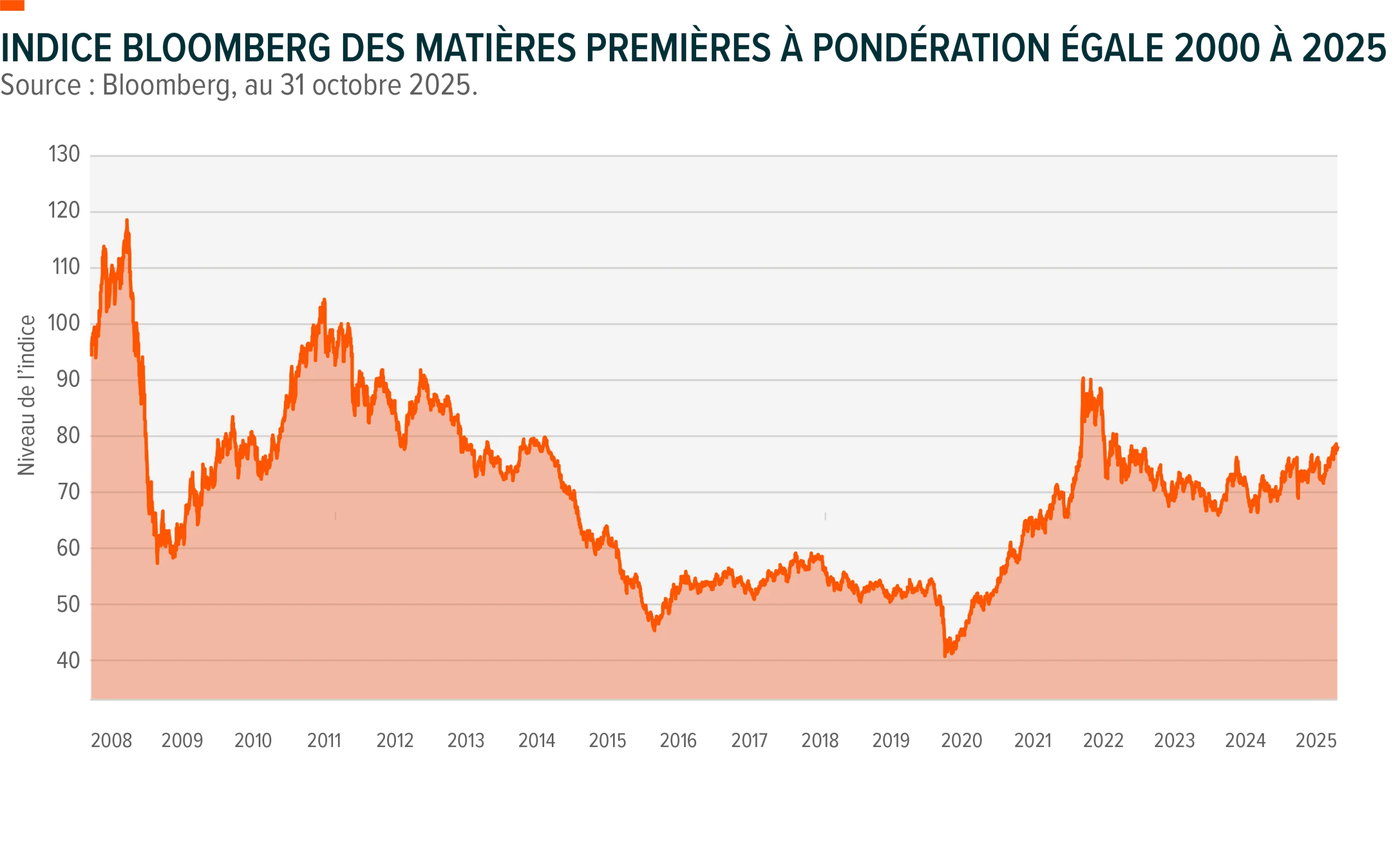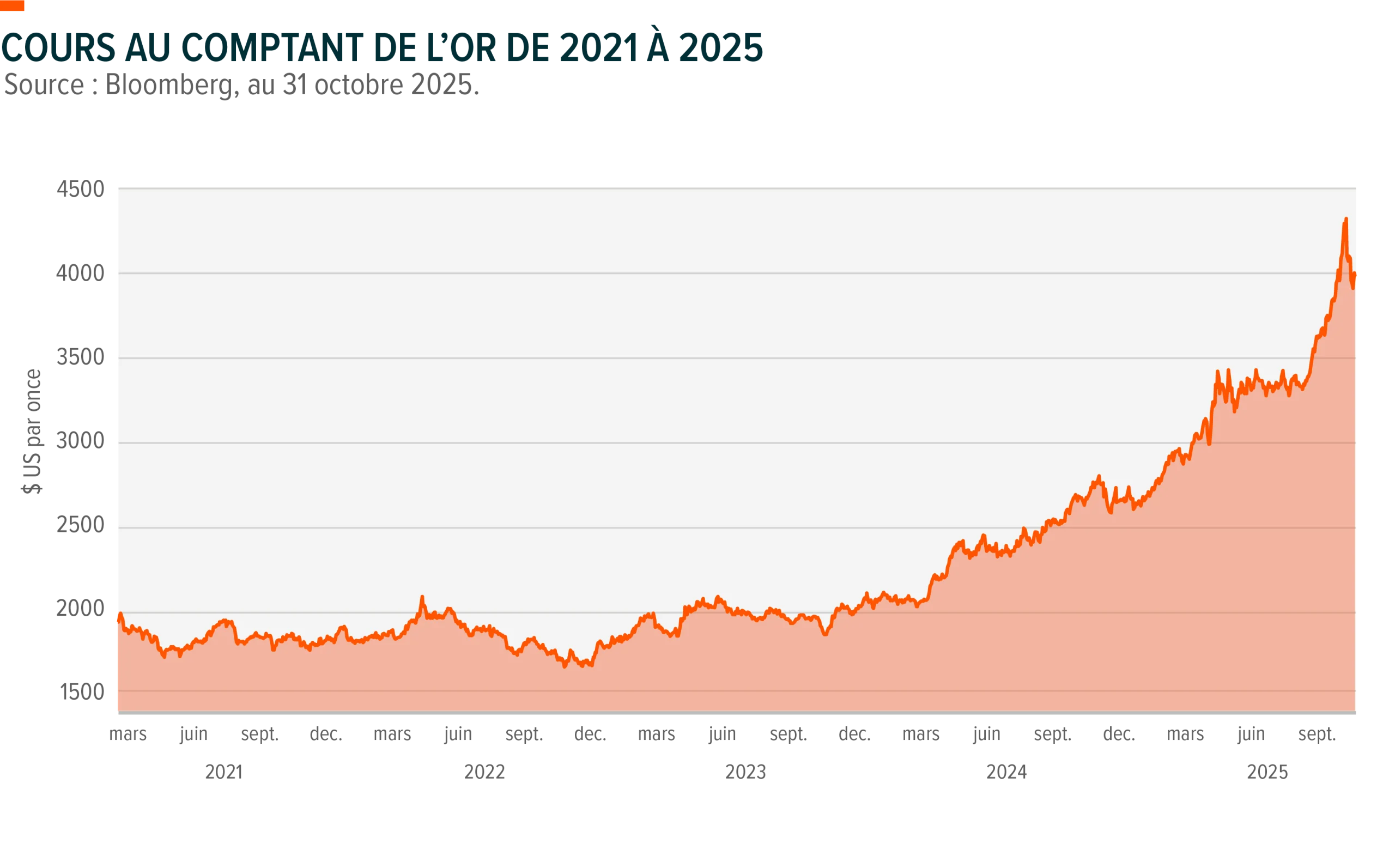 L’or a affiché de bons résultats jusqu’à présent en 2025, soit une hausse de 53 %1 depuis le début de l’année au 30 octobre 2025. Il a subi quelques reculs en cours d’année, mais rien de significatif. L’or a fait l’objet d’une grande attention médiatique, atteignant des sommets historiques en 2025. Toutefois, les investisseurs particuliers et institutionnels des marchés nord-américains ne se sont pas encore de gros acheteurs du métal jaune. La plupart des achats d’or proviennent des banques centrales non occidentales et des investisseurs particuliers en Asie. Actuellement, le portefeuille institutionnel moyen détient environ 4 % d’or, ce qui est bien en deçà des normes historiques. Si les investisseurs occidentaux s’intéressent davantage à l’or en 2026, cela pourrait fortement soutenir sa hausse.