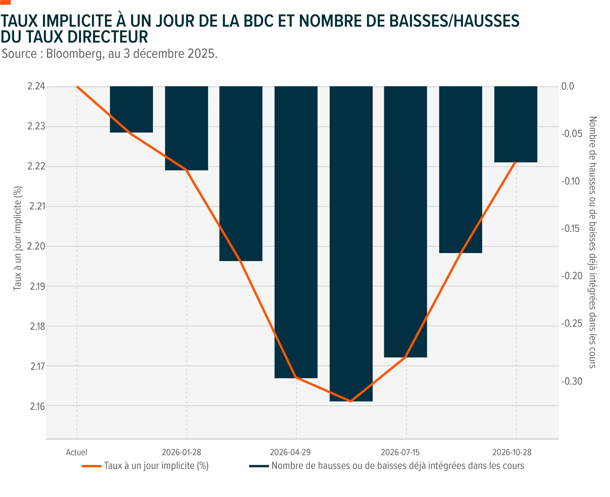 Aux États-Unis, le resserrement des conditions du marché du travail, les pressions liées aux droits de douane et l’évolution des attentes en politique façonnent les perspectives économiques pour 2026. Aux États-Unis, nous sommes d’avis que le marché du travail tendu devrait continuer à exercer une pression à la hausse sur les salaires. L’offre de main-d’œuvre demeure problématique au sud de la frontière, où les autorités ont adopté une approche stricte en matière d’immigration. Il est aussi possible que les prix à la consommation continuent de suivre une tendance haussière, les entreprises transférant lentement aux clients les coûts plus élevés liés aux tarifs douaniers. Nous nous attendons également à ce que la courbe des taux continue de s’accentuer à mesure que les taux à court terme baissent et que les taux à long terme se maintiennent en raison des préoccupations liées à l’inflation liée aux droits de douane susmentionnés et à la croissance continue des salaires.