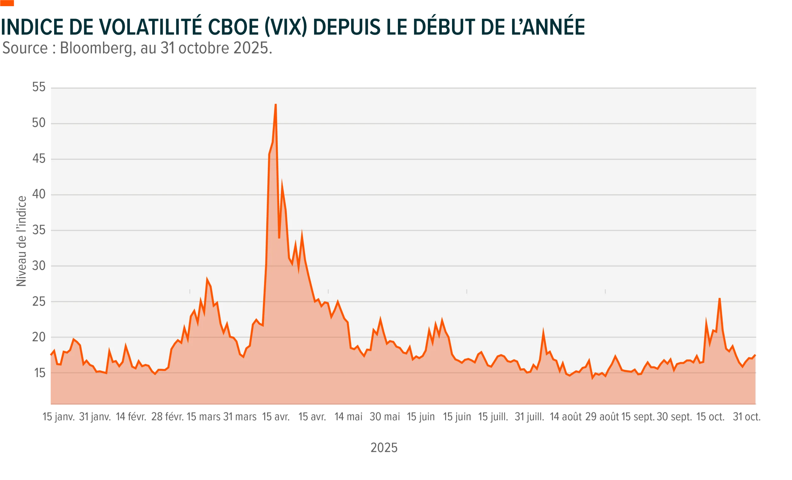 L’indice de volatilité (VIX) a été légèrement plus élevé en 2025 que l’année précédente, ce qui s’explique par l’accumulation d’incertitudes causées par l’administration américaine sur tous les marchés. Le volume de l’indice VIX a aussi été plus élevé en moyenne en 2025, ce qui indique que ses fluctuations se produisent plus rapidement et que le marché est plus sensible aux mouvements de l’indice S&P 500 (SPX), ce qui explique la reprise plus rapide observée après les replis en 2025. L’augmentation du risque de concentration dans les principaux indices, le niveau élevé des ratios cours/bénéfice et le paysage en constante évolution de l’IA pourraient entraîner une volatilité supérieure à la moyenne en 2026, moment où la publication de résultats décevants d’une seule société technologique à très forte capitalisation pourrait suffire à déclencher une correction à l’échelle du marché.