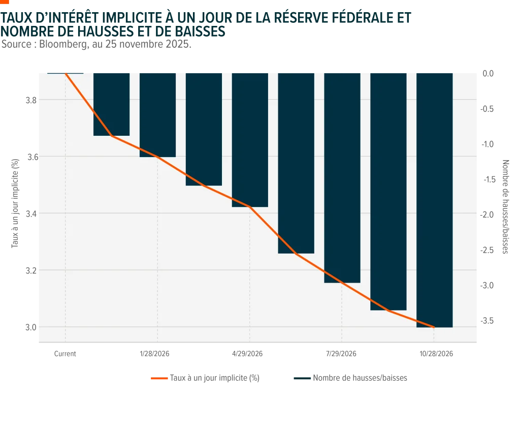 Les mandats de la Fed divergent alors que le marché du travail s’affaiblit et que l’inflation persiste, ce qui limite la souplesse de sa politique monétaire sur les marchés des titres à revenu fixe à l’aube de 2026. À l’approche de 2026, la Réserve fédérale américaine (la « Fed ») fait face à des pressions croissantes, son double mandat (plein emploi et stabilité des prix) étant mis à l’épreuve. Le marché du travail montre une faiblesse continue tandis que l’inflation demeure plus tenace que prévu, ce qui rend difficile pour les décideurs politiques de concilier ces deux objectifs. Cette divergence complique la mise en œuvre d’une politique monétaire efficace. Des spéculations ont émergé quant à la cessation du resserrement quantitatif, qui pourrait avoir pour effet d’injecter des liquidités supplémentaires sur les marchés et potentiellement faire baisser les rendements obligataires. On envisage aussi la possibilité d’un contrôle de la courbe des taux assorti d’une préférence pour l’achat d’obligations à long terme. De telles mesures pourraient aider à limiter l’impact de l’inflation sur la partie longue de la courbe, bien qu’elles introduisent une complexité et une incertitude accrues en ce qui concerne les perspectives de politique monétaire.