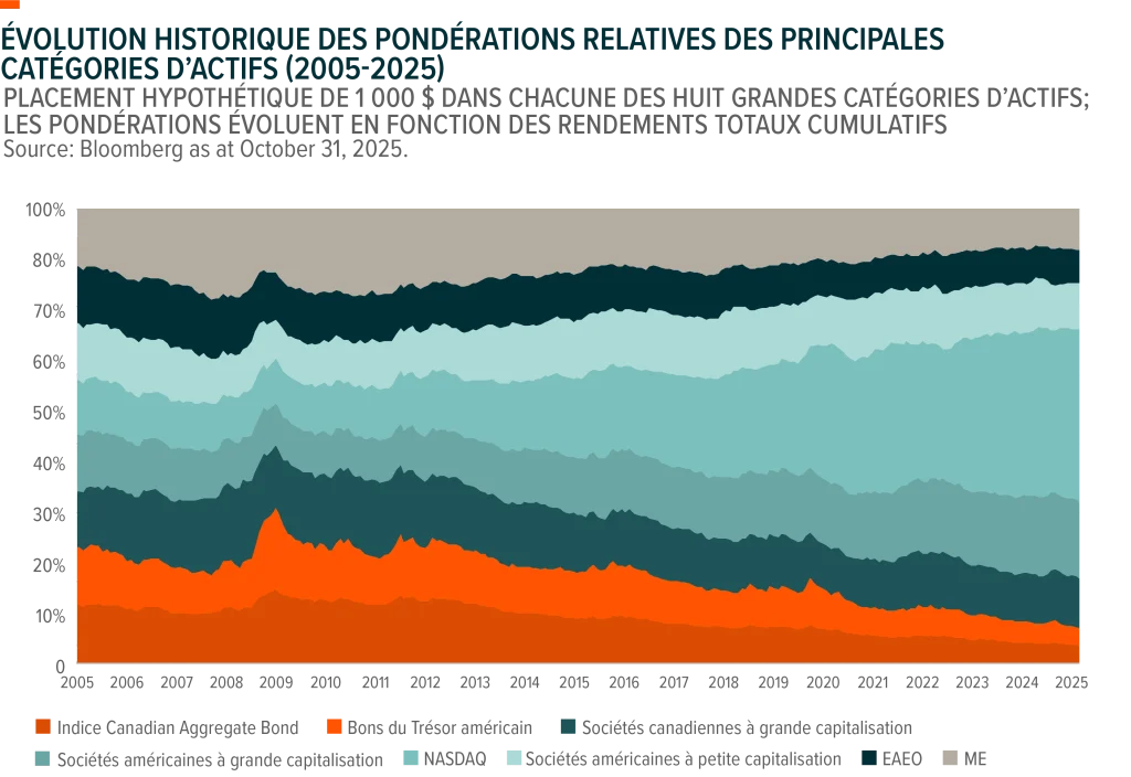 La diversification du portefeuille a démontré son efficacité au début de 2025, les actions américaines ayant affiché un retard par rapport au Canada et aux régions EAEO et des ME. Une diversification stratégique répartit l’exposition entre des marchés aux cycles et caractéristiques différents, ce qui est distinct de la couverture contre les risques extrêmes ou des paris à court terme sur la direction du marché. Dans les scénarios de base, de correction et de croissance, la diversification stabilise les résultats à long terme : en favorisant les fondamentaux dans le scénario de base, en soutenant la vigueur internationale dans une correction axée sur les valorisations et en maintenant l’exposition à l’élan du marché nord-américain, y compris aux sociétés américaines à grande capitalisation du secteur des technologies, dans une tendance de croissance. La diversification demeure essentielle dans la gestion de l’évolution des conditions macroéconomiques au sein de la part du portefeuille d’un investisseur canadien investie dans les actions.
