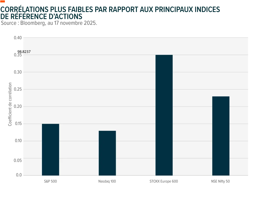 Vers la mi-octobre 2025, les investisseurs ont vendu une partie de leurs placements dans ce secteur afin de réaliser leurs gains. Compte tenu de l’ampleur et de la durée de la reprise, les placements à effet de levier et dans les produits dérivés ont entraîné une forte hausse de la volatilité au cours de la période. Ces mouvements de liquidité ont tendance à être des exceptions par rapport à la volatilité moyenne, mais étant donné que la tendance sous-jacente et les fondamentaux demeurent d’actualité, des événements comparables pourraient se produire l’année prochaine. De tels événements soutiendraient le rendement généré sur les marchés d’options, offrant des distributions attractives sur une base d’actifs qui, autrement, ne génère pas de rendement.