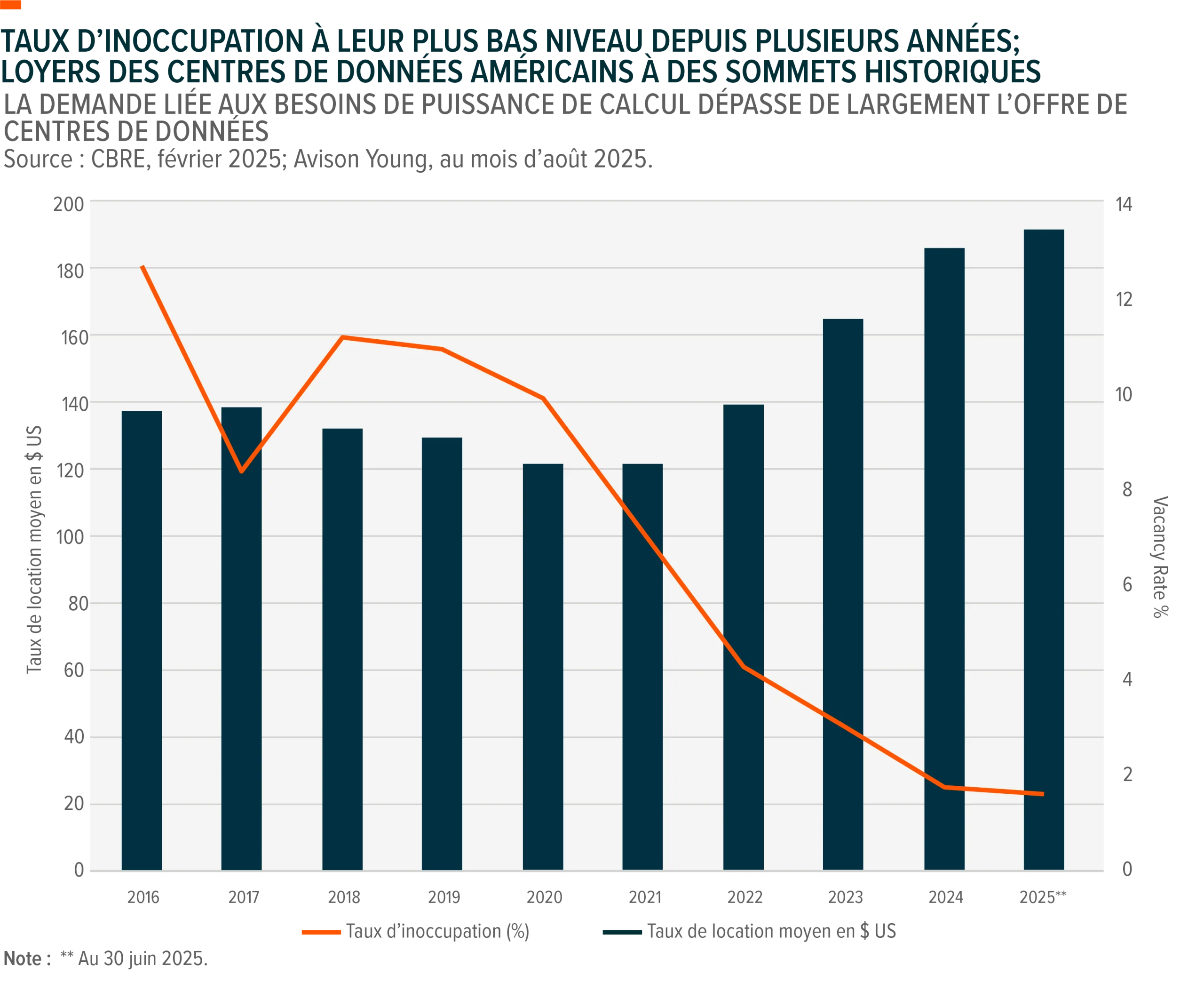 La capacité de calcul – y compris les centres de données, le matériel informatique, l’alimentation électrique et les unités de traitement graphique (UTG) – demeure chroniquement limitée, ce qui confère un pouvoir de fixation des prix et génère des flux de trésorerie durables pour les exploitants, les systèmes et les fournisseurs d’intrants. Les développements de centres de données à très grande échelle et les baux à long terme ont fait chuter les taux d’inoccupation à des niveaux historiquement bas. Les principaux fournisseurs de services infonuagiques constatent une demande qui dépasse la capacité d’IA disponible, si bien que des UTG restent inutilisées en stock faute d’alimentation électrique ou de connectivité. Dans de nombreux cas, les UTG ne peuvent pas être installées en raison de limitations d’alimentation électrique ou de connectivité des baies. Ces limitations et les goulets d’étranglement de l’offre se traduisent par des loyers élevés et une croissance des revenus à long terme pour les fournisseurs de centres de données, les fournisseurs de services de colocation, les intrants et les intégrateurs d’infrastructure.