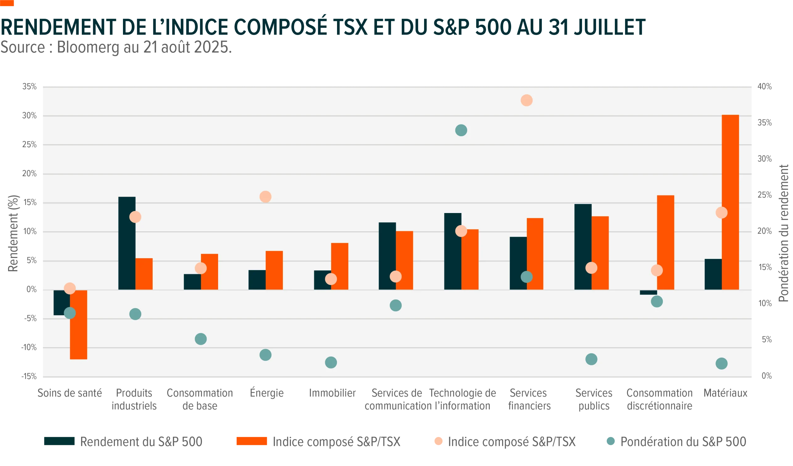 En dépit des tensions liées aux tarifs, les Canadiens ont connu une bonne année 2025, le principal marché boursier affichant un solide rendement : du début de l’année au 31 juillet, l’indice composé S&P/TSX® a progressé de 9,5 %. Au sud de la frontière, l’indice S&P 500 a progressé de 6,8 %.