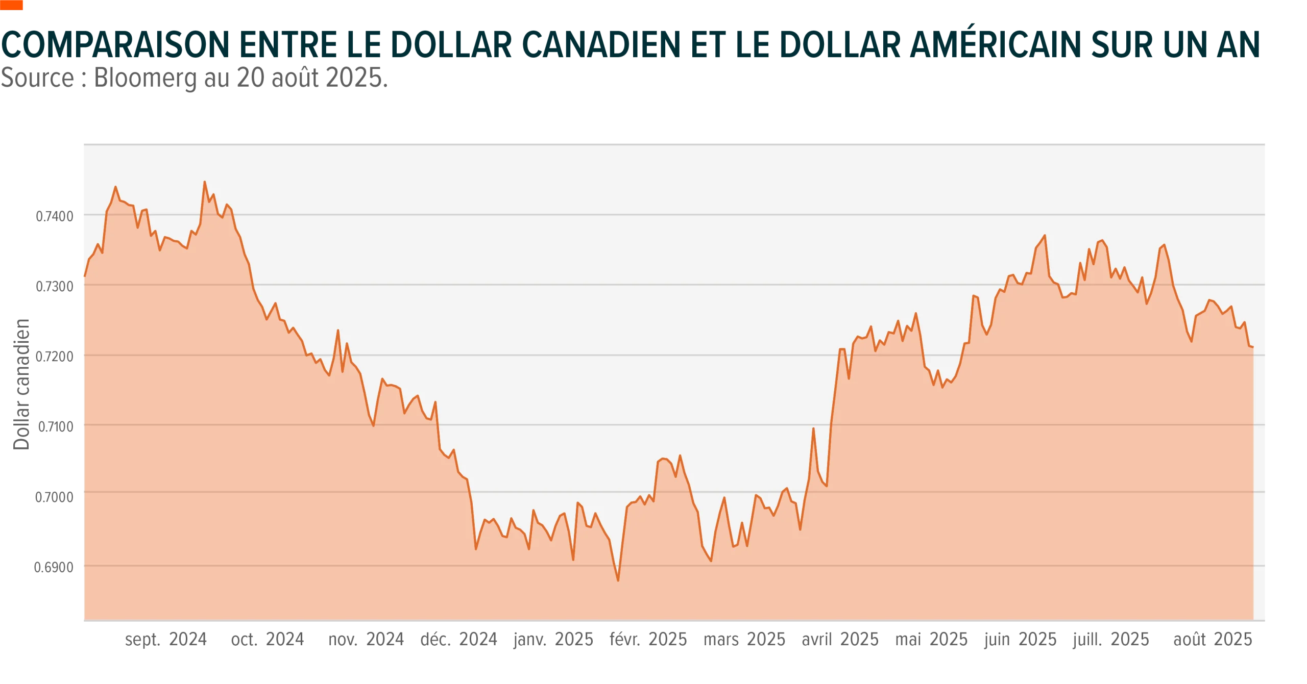 Le délai reste imprévisible et la volatilité est probable. Pour un investisseur canadien, ne pas couvrir le risque de change revient à laisser les rendements des actions américaines dépendre du taux de change : un renforcement du huard rognerait les gains, alors qu’un affaiblissement les bonifierait. La couverture de change permet de neutraliser cette volatilité, mais elle engendre des coûts directs et pourrait générer un rendement inférieur en cas de dépréciation du dollar canadien.
