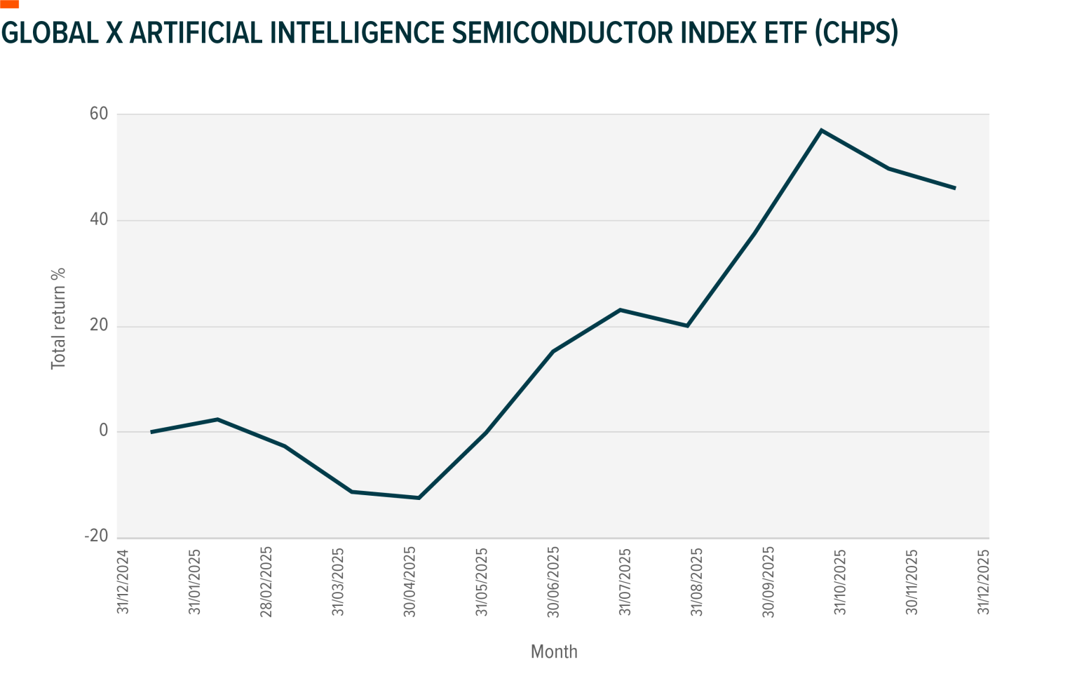 As Canada’s first semiconductor-focused ETF, CHPS offered Canadian investors direct exposure to the foundational technology powering the ongoing artificial intelligence revolution and broader digital transformation. In 2025, the semiconductor sector delivered one of its strongest years in memory, logic, and AI-related demand as chip sales surged and stocks participated in that momentum — with leading names like Nvidia up roughly 50% for the year amid extraordinary appetite for AI training and inference hardware. Global data suggests semiconductor sales approached record levels as demand from data centres, cloud services, and next-generation computing applications lifted revenue and market sentiment across the ecosystem. This broad structural growth helped CHPS capture both cyclical strength and secular investment themes tied to compute, connectivity and AI deployment.