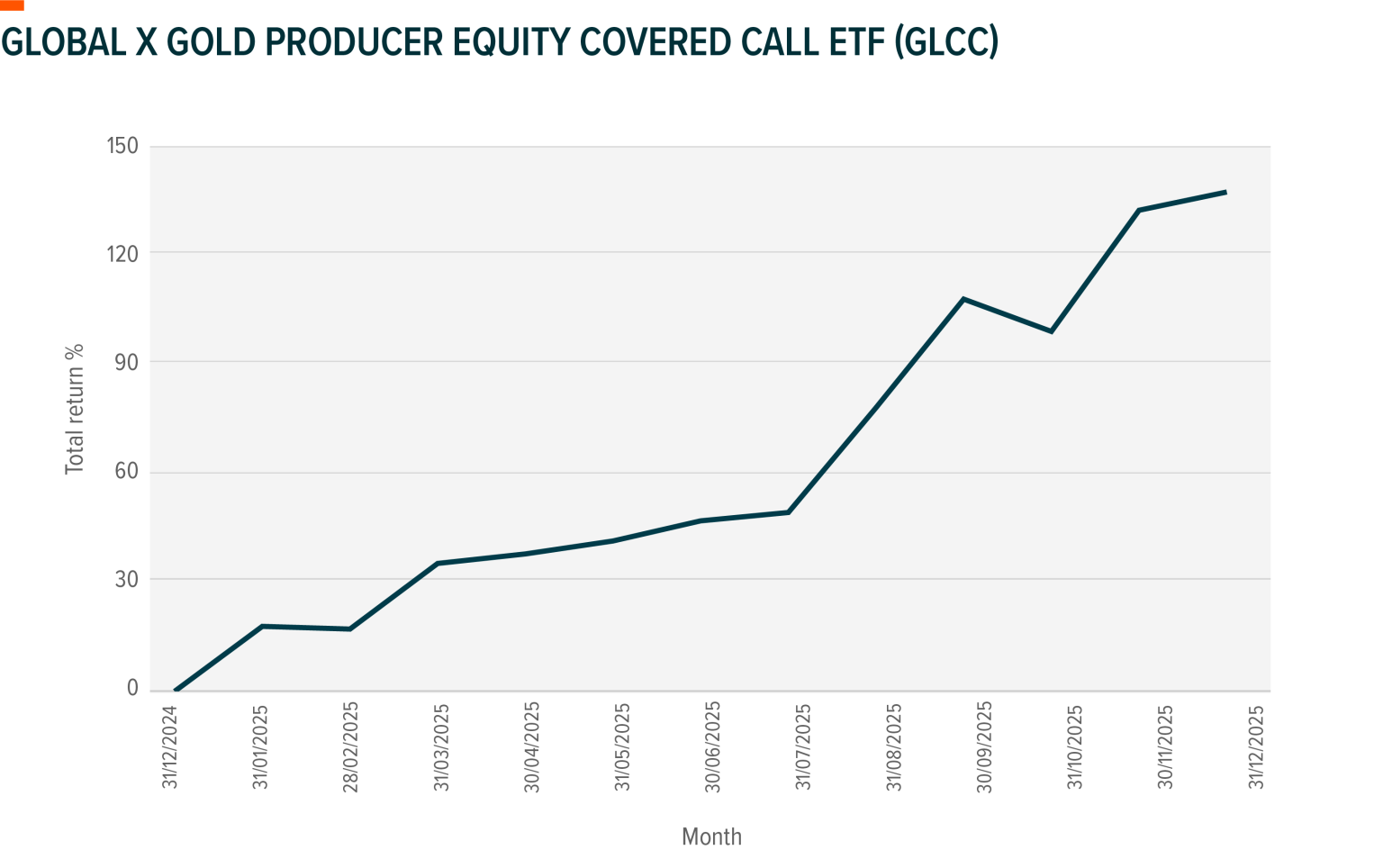 Against a backdrop of elevated volatility and persistent demand for yield, GLCC emerged as one of Canada’s best-performing covered call ETFs in 2025. By harvesting option premiums on a diversified set of North American listed gold producers, GLCC was able to deliver attractive total returns while differentiating itself from both traditional gold equity funds and other covered call products.