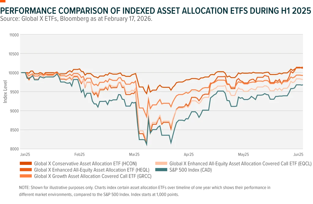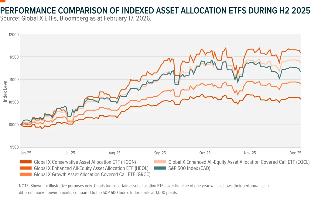 FOR ILLUSTRATIVE PURPOSES ONLY These charts index certain Global X Asset Allocation ETFs over a timeline of one year (split in two to 2025’s varying market conditions). The index starts at 10,000 points. These charts do not cover all potential market scenarios but do show how these indexed funds performed over a year that saw high volatility and uncertainty.